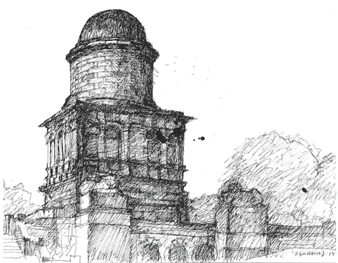 Duke of Hamilton Mausoleum, Hamilton, Scotland by David Shaw Nicholls, 1974. Pen and Ink drawing.