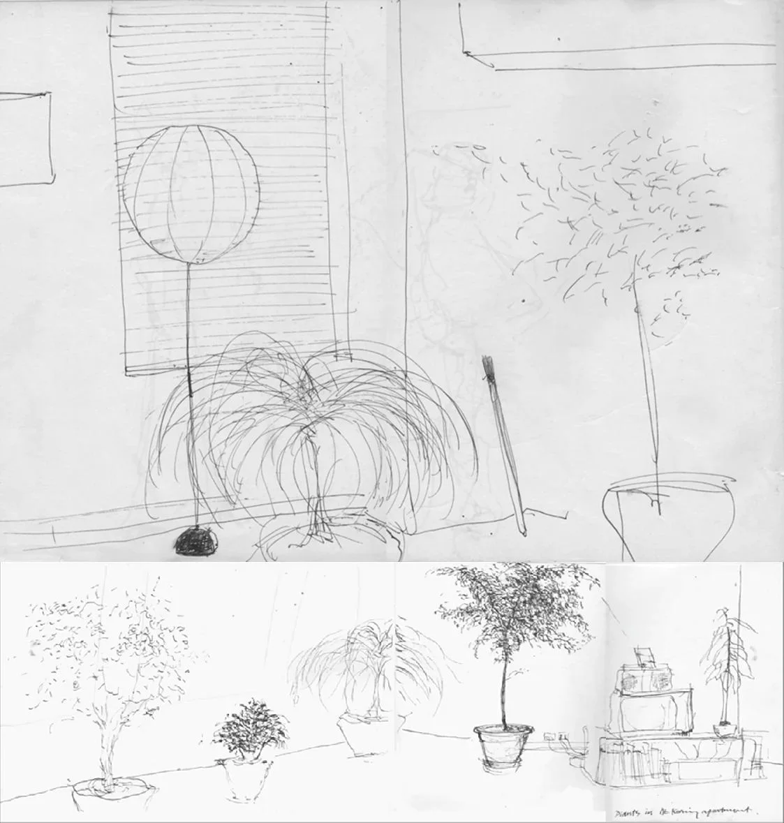 Guest in Willem de Kooning loft in New York, “His Brush in the Corner” (top) and “Main Room Landscaping, effort” (below). “I swear I never watched the T.V.” “DSN” Drawings by David Shaw Nicholls. Pen on paper, in the NYC sketch Pad. Circa 1981.