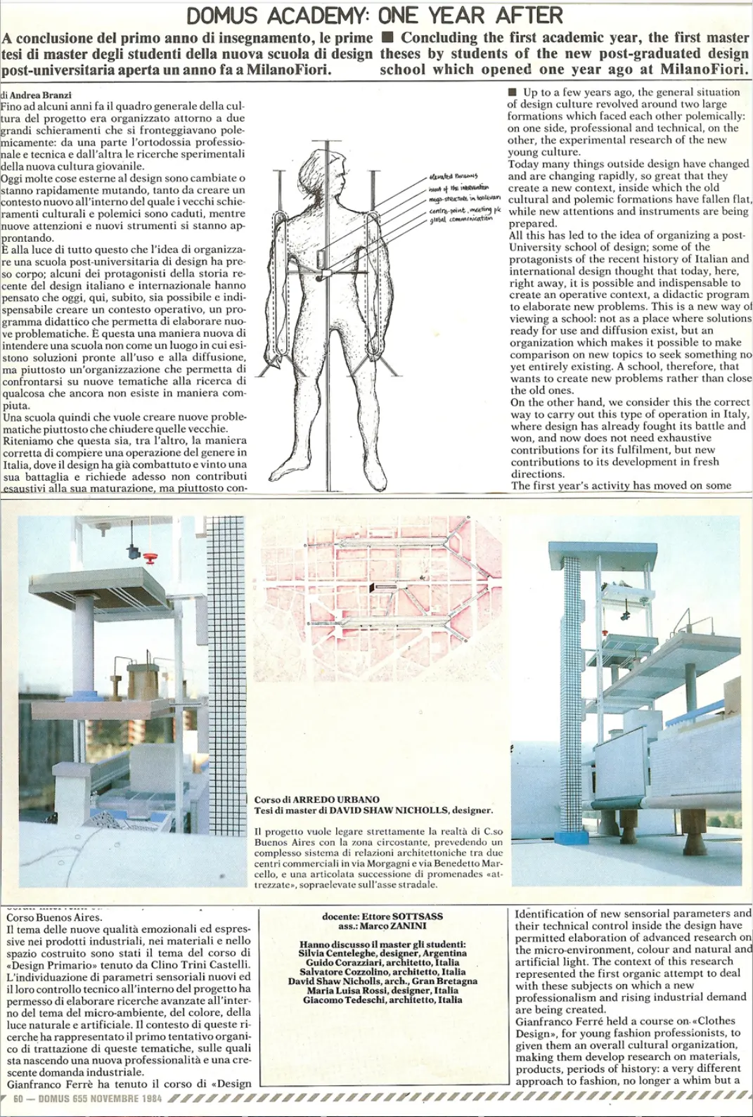 In 1983-84 “David Shaw Nicholls” attends Domus Academy (the year of its inception) where he graduated under Ettore Sottsass Jnr in the course of Urban Architecture (Arredo Urbano). Active in “DA” workshops by Achillie Castiglione, Clino Castelli, Gianfranco Ferre, Rem Koolhaas, Rob Krier, Mario Bellini, Pierre Restany, Andrea Branzi, Toshiyuki Kita, El- Wakil. Factory and Studio Visits: Kartell, B&B Italia, Giorgetto Giugiaro, Olivetti and Pininfarina Spa.