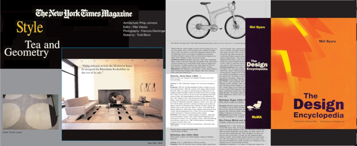 Sees the launch of his “Classic Modern” Carpet Collection and a totally bespoke opportunity to launch a minimum group of designs. "Abacus, Athena, Badoura , Constantinople, Lima, Maui, Tzar, Prado" In the picture (top): PRADO carpet design for Philip Johnson Architect. In the picture (bottom): MoMa > Museum of Modern Art, New York. “The Design Encyclopedia”
