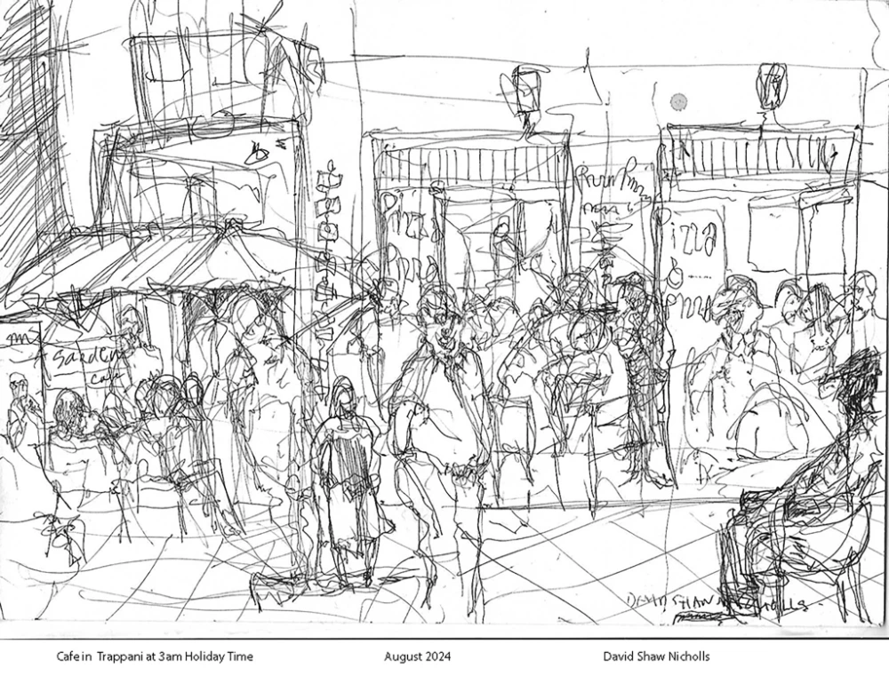 Right: Sketch at 3am outside the local corner Cafe in Trappani, Sicily black ink on paper.